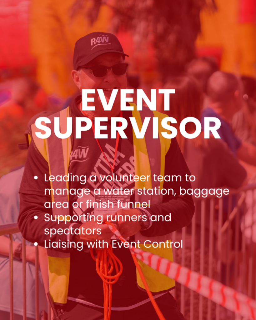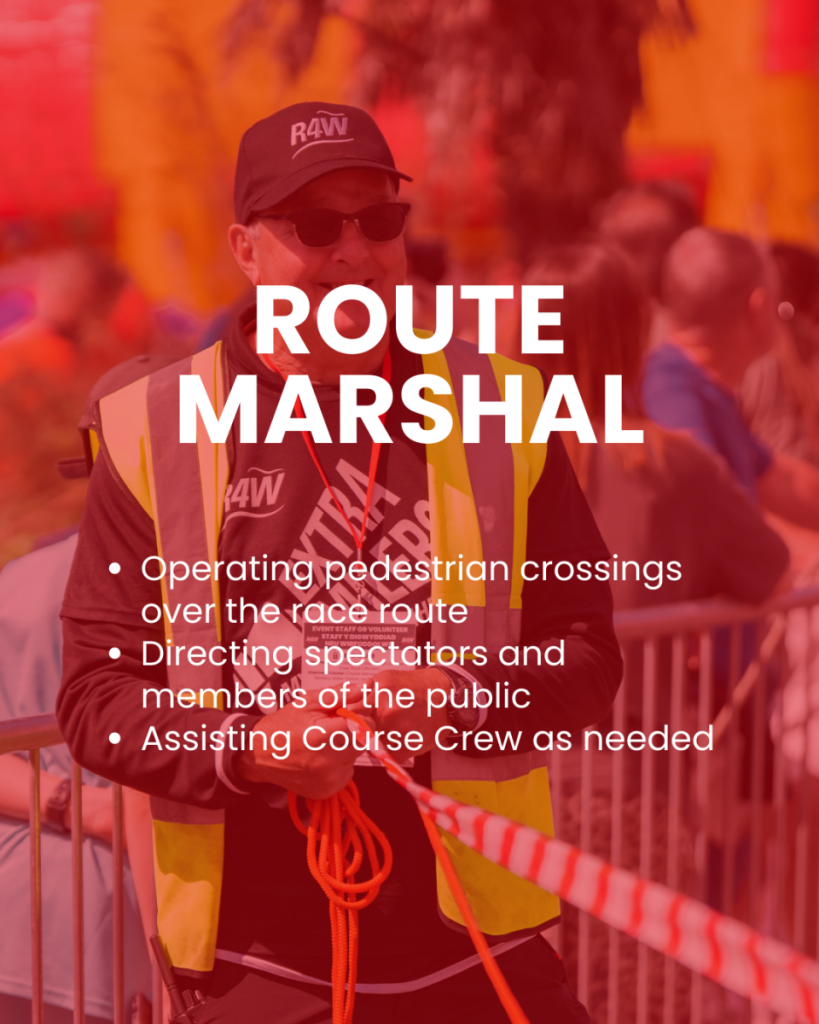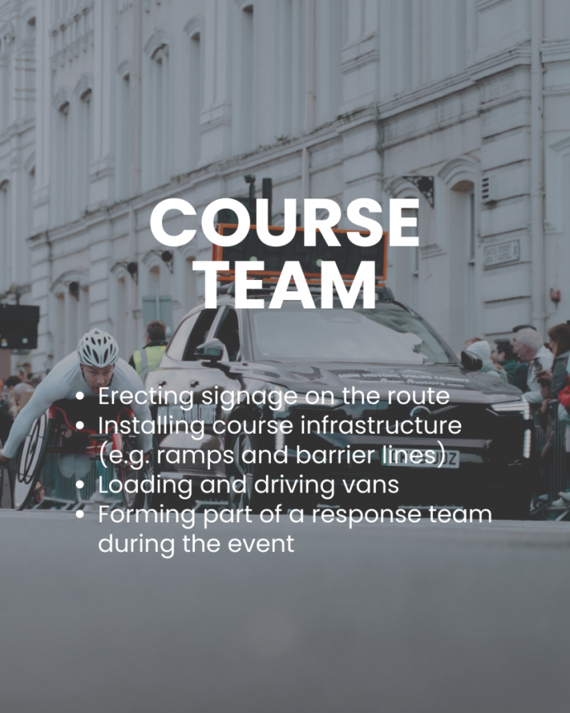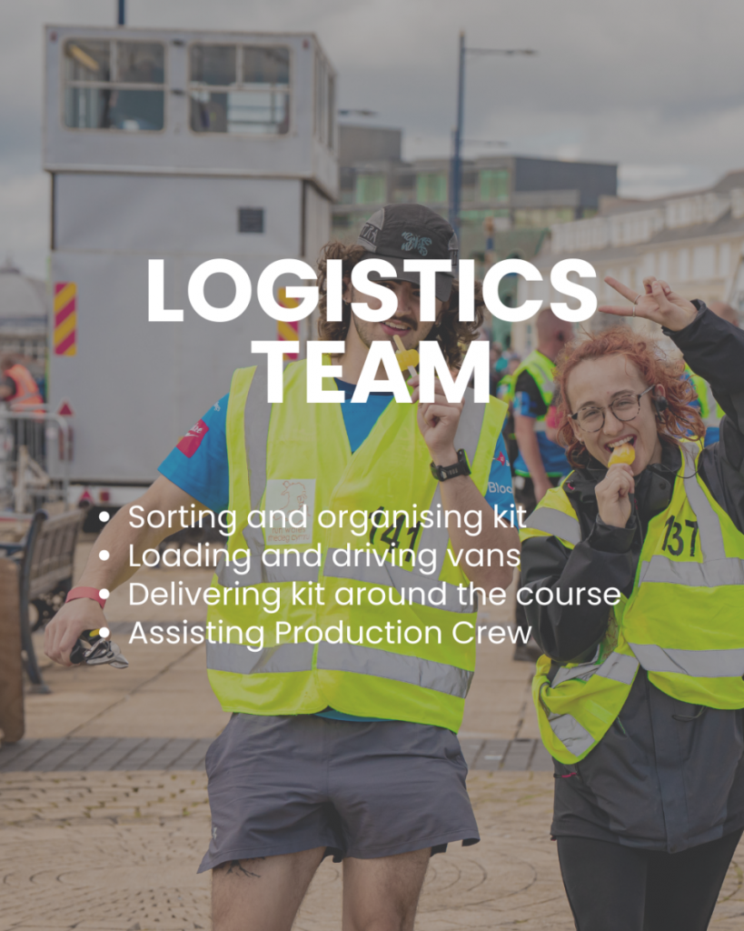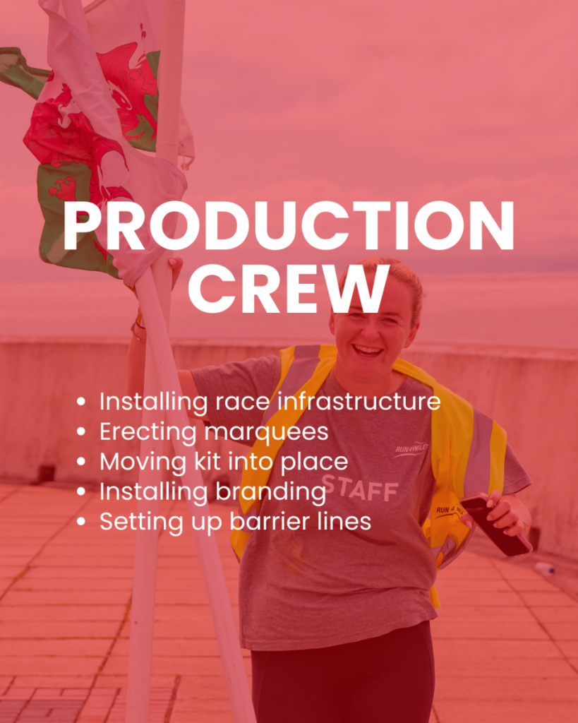 Roles include Production Crew (setting up race infrastructure like barriers, the start-finish gantries, marquees and moving kit into place), Parking Marshal (welcoming runners and spectators as they arrive at the event car parks), Route Marshal (operating pedestrian crossings over the race route), Logistics Team (sorting and organising kit at our warehouse, loading vans and delivering essential kit around the course), Course Crew (erecting signage and route infrastructure, marking out the course and being part of a response team during the event) and Event Supervisors (leading a volunteer team to manage a water station, baggage area or finish funnel).