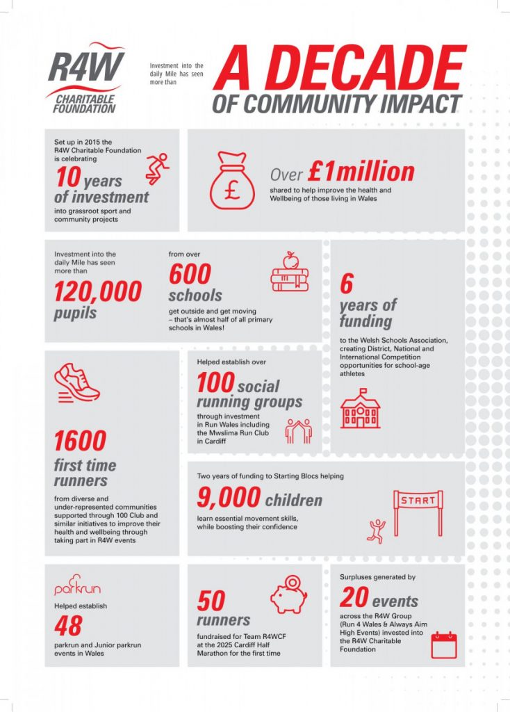 Rob Cole, Chair of the R4W Charitable Foundation, added: “We’re so proud to be marking our 10-year anniversary and celebrating the generosity and spirit of the running community at R4W events. Every donation makes a huge difference and we’d like to thank every participant who has played a part in helping us fund projects that inspire and encourage activity across Wales. We’re looking forward to the next decade of increasing our impact and continuing to champion community wellbeing through sport.”